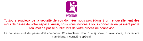 Cher(e) adhérent(e), votre espace adhérent évolue. Si vous n'avez pas encore activé votre nouvel espace, la saisie de vos informations de première connexion est nécessaire pour des raisons de sécurité. Cliquez sur "Mot de passe oublié ?" et suivez les instructions pour activer votre compte.